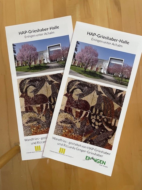 Förderverein und Gemeinde Eningen haben auf Anregung von Otto Hauptmann einen Flyer gestaltet und drucken lassen. Er erläutert die Geschichte und Einmaligkeit dieses Werkes für die Besucher der Halle. HAP Grieshaber und seine Frau Riccarda Gregor-Grieshaber, sowie die Eninger Gipsergesellen Kurt Walz und Adolf Hummel arbeiteten sechs Monate im Jahr 1957 – 58 daran.